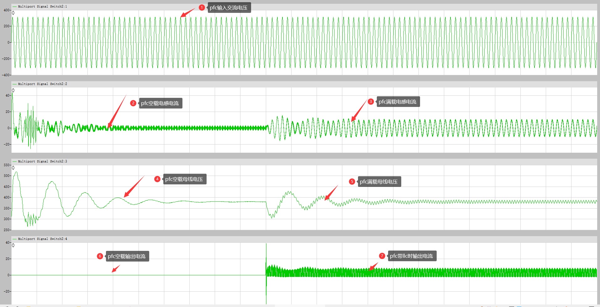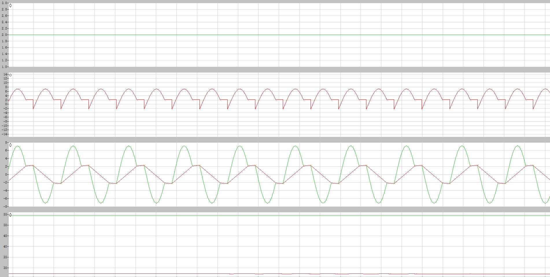 实际调试中发现,LLC工作在固定频率时,通过调节移相量就能实现双向能量流动,省去了复杂的频率跟踪算法。整流模式下,pfc为单相pwm整流器,输入电压220V,50Hz,llc输出电压55V。整流模式下,pfc为单相pwm整流器,输入电压220V,50Hz,llc输出电压55V。逆变模式下,llc输入电压55V,逆变输出220V,50Hz交流。逆变模式下,llc输入电压55V,逆变输出220V,50